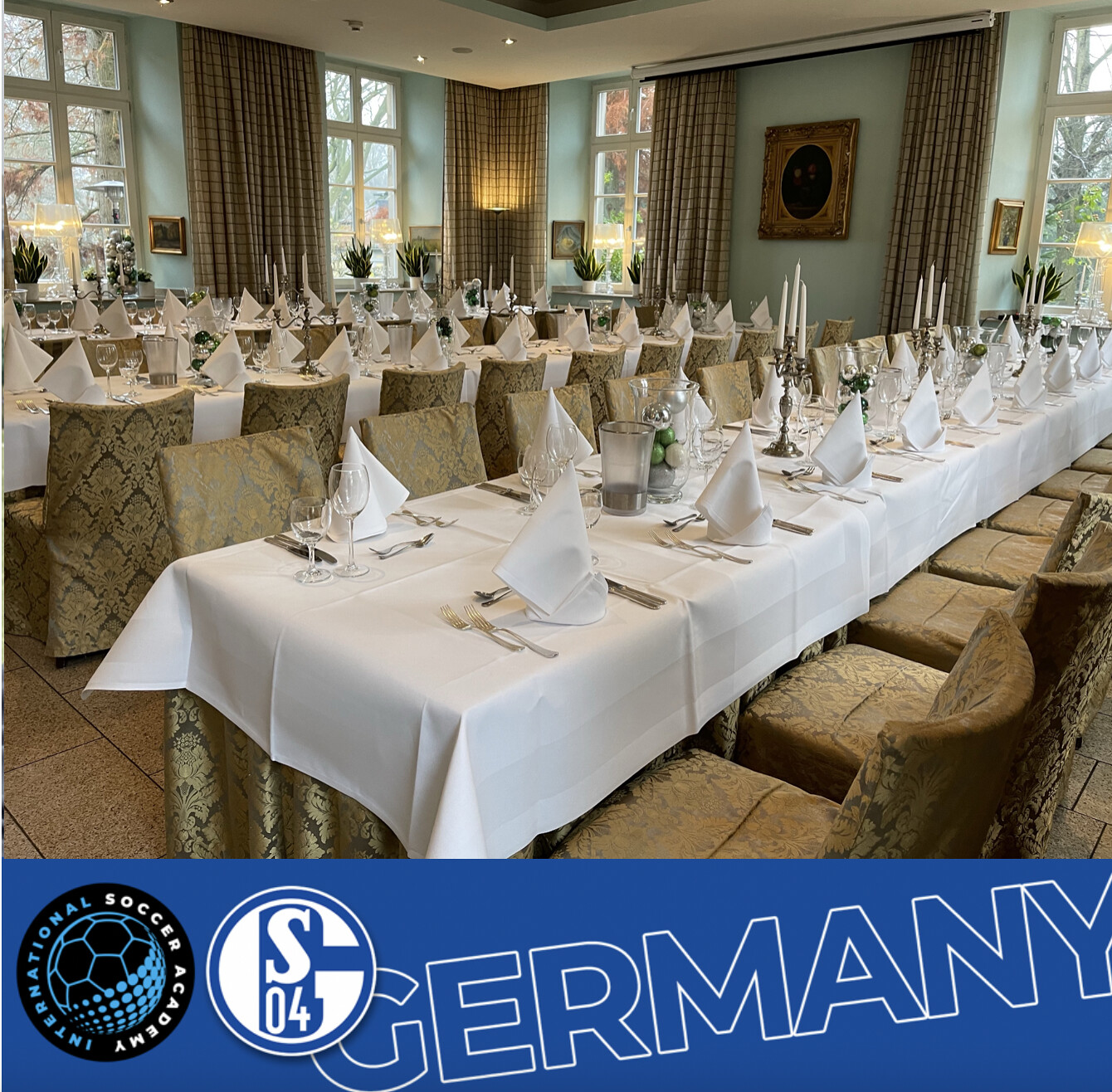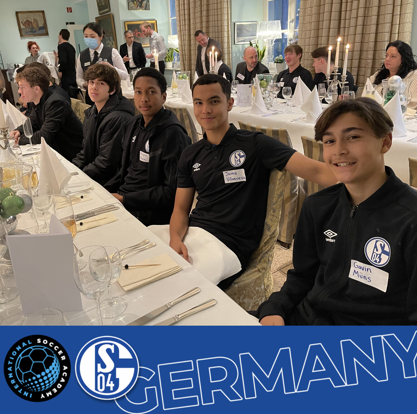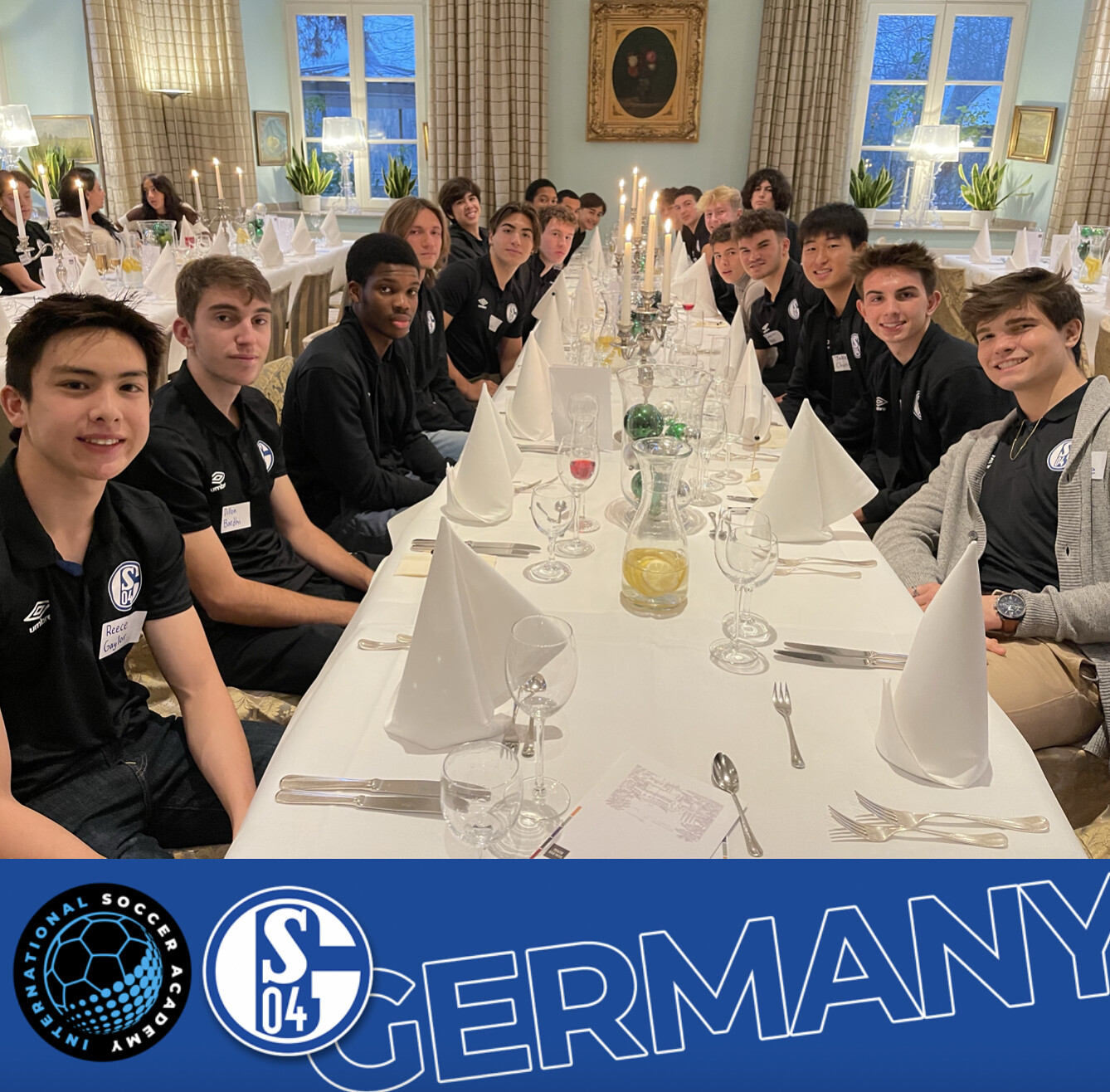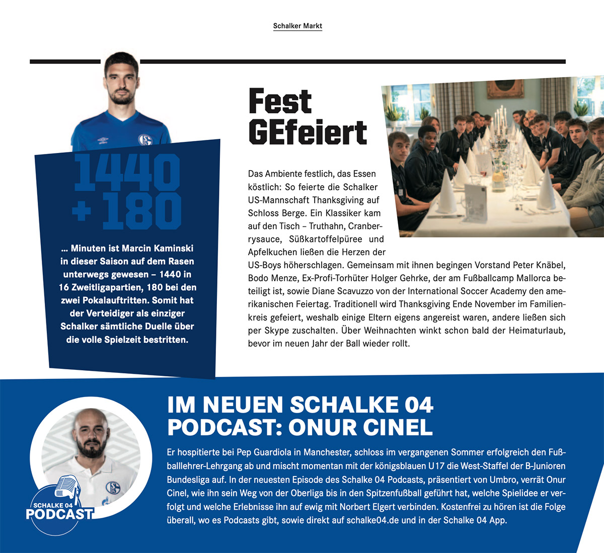 The atmosphere festive, the food delicious: This is how the Schalke US team celebrated Thanksgiving at Schloss Berge. A classic was served – turkey, cranberry sauce, mashed sweet potatoes and apple pie made the hearts of the US boys beat faster. Board members Peter Knäbel, Bodo Menze, ex-professional goalkeeper Holger Gehrke, who is involved in the Mallorca soccer camp, and Diane Scavuzzo from the International Soccer Academy celebrated the American holiday with them. Traditionally, Thanksgiving is celebrated in the family circle at the end of November, which is why some parents had come specially, while others could be connected via Skype. Home leave soon beckons over Christmas, before the ball rolls again in the new year.