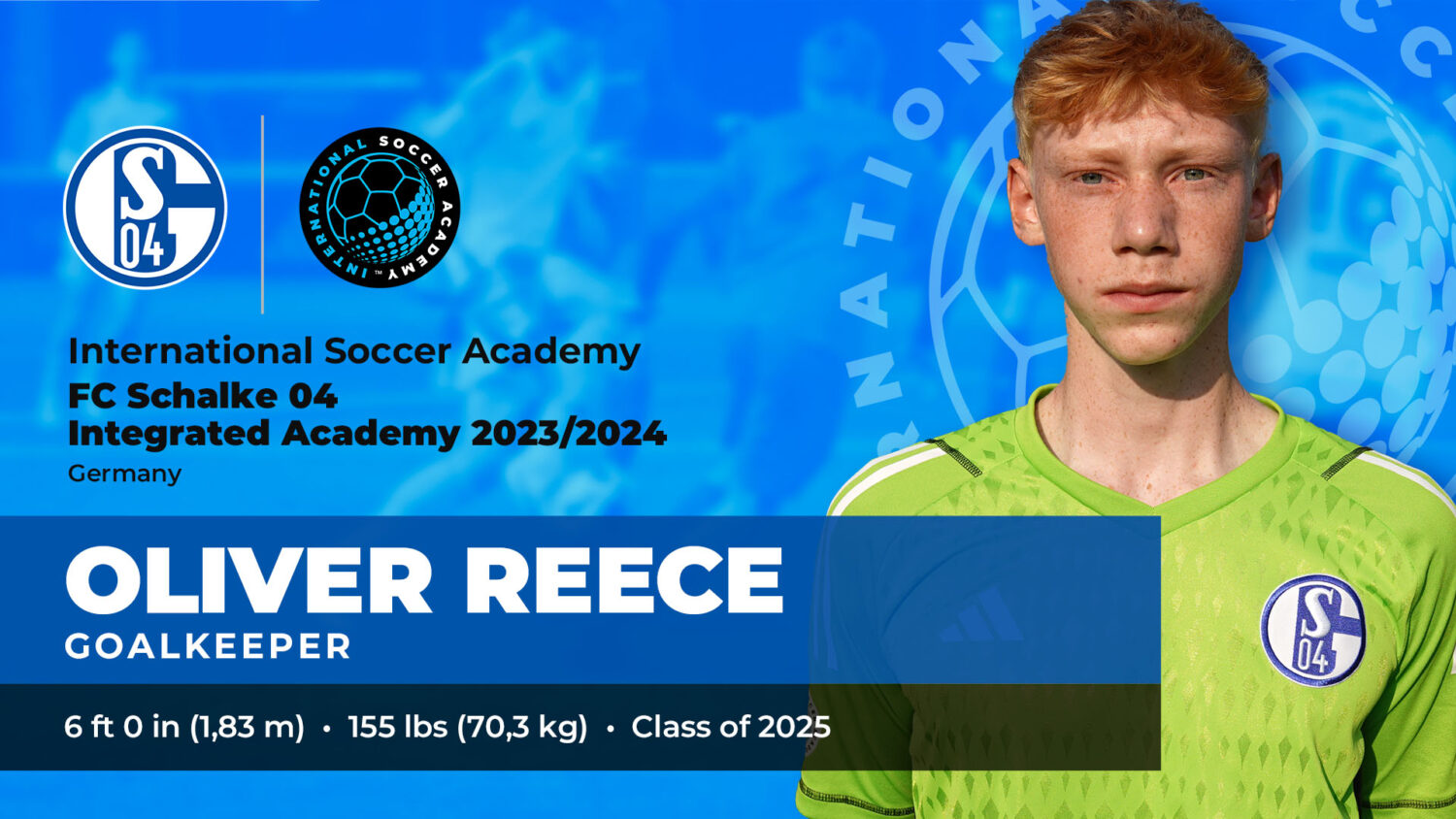 • Other Accolades: On the pitch, Oliver has trained with international clubs at the youth level including, the Deutsches Fußball Internat in Bad Aibling, Germany. He has also trained with former Manchester United GK coach Eric Steele, Loyola University GK coach Matt Pasquinelli, and former player/coach Alex Horwath from Real Salt Lake, New York Red Bull, and Ljungskile SK. With his previous club, Oliver regularly trained under head GK coach John Szaro from George Washington University and former professional goalkeeper Chris Torres. Prior to joining the Schalke 04 Integrated Academy, Oliver studied at the German International School of Washington D.C., a STEM/MINT affiliated institution. He carries a GPA of 4.0 (Durchschnitt: 1,4) and is working towards his Abitur and American HS Diploma. In 2022, he won the top prize in the Engineering Talent Competition of North Bayern (Nachwuchspreis des VDE Nordbayern) and in 2023, was a Wirtschaftsprojekt/Entrepreneurship Competition finalist. Oliver speaks fluent German, English, and basic French.